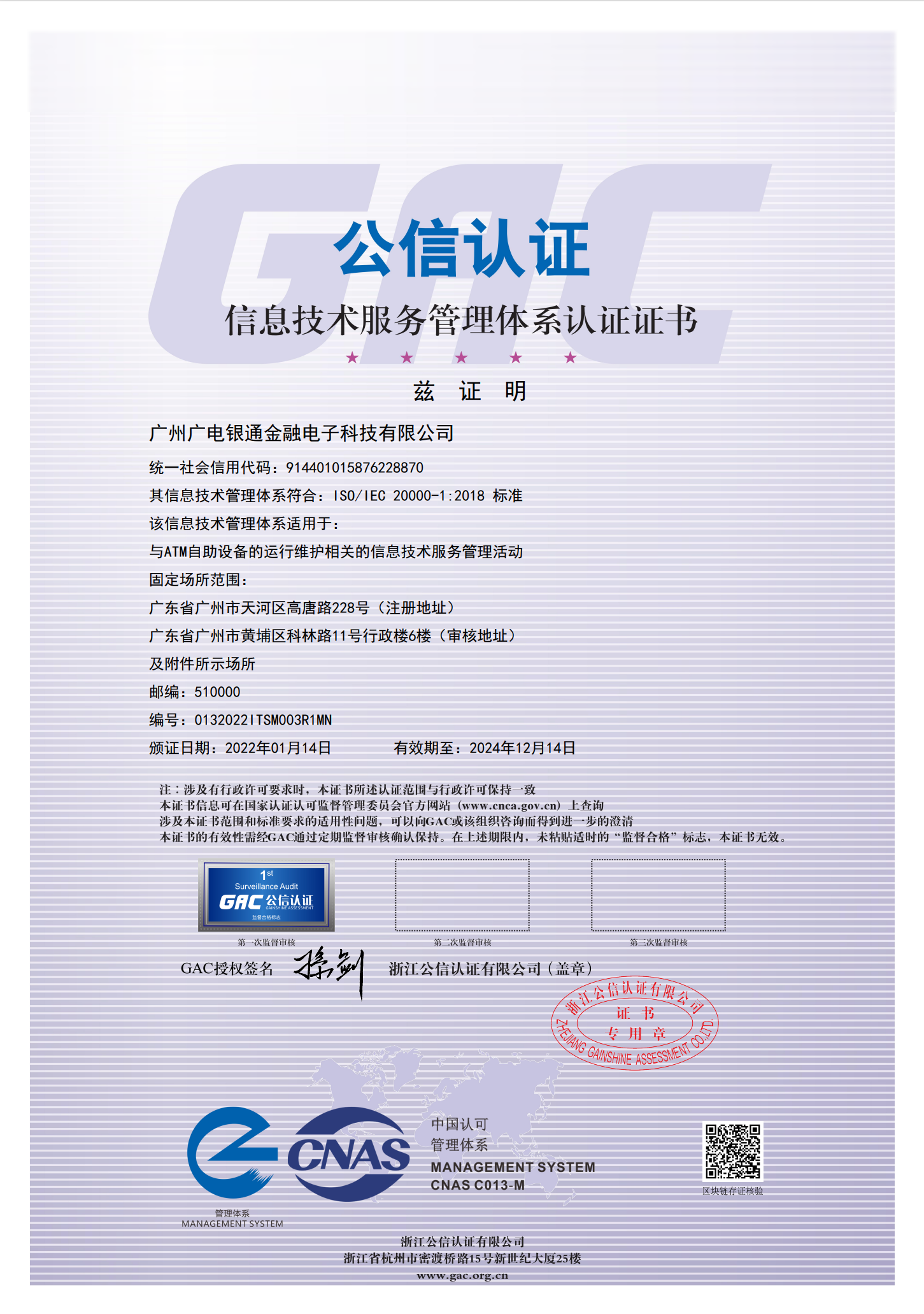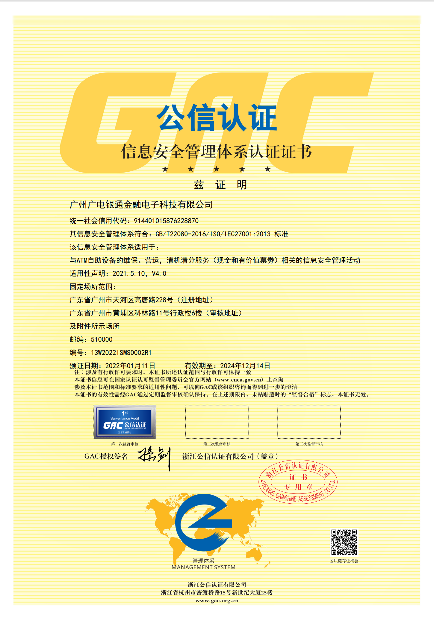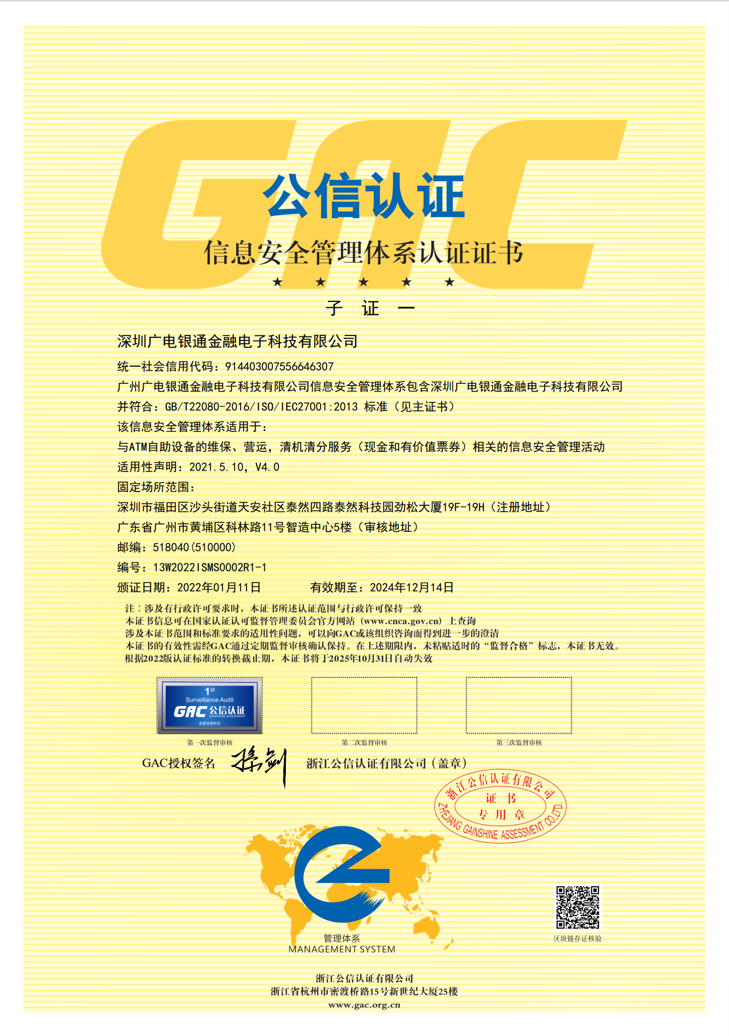 深圳銀通信息安全管理體系認(rèn)證證書2023