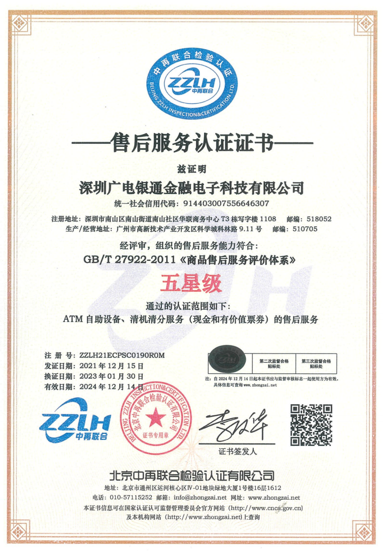 深圳銀通五星售后服務(wù)認(rèn)證證書-正本