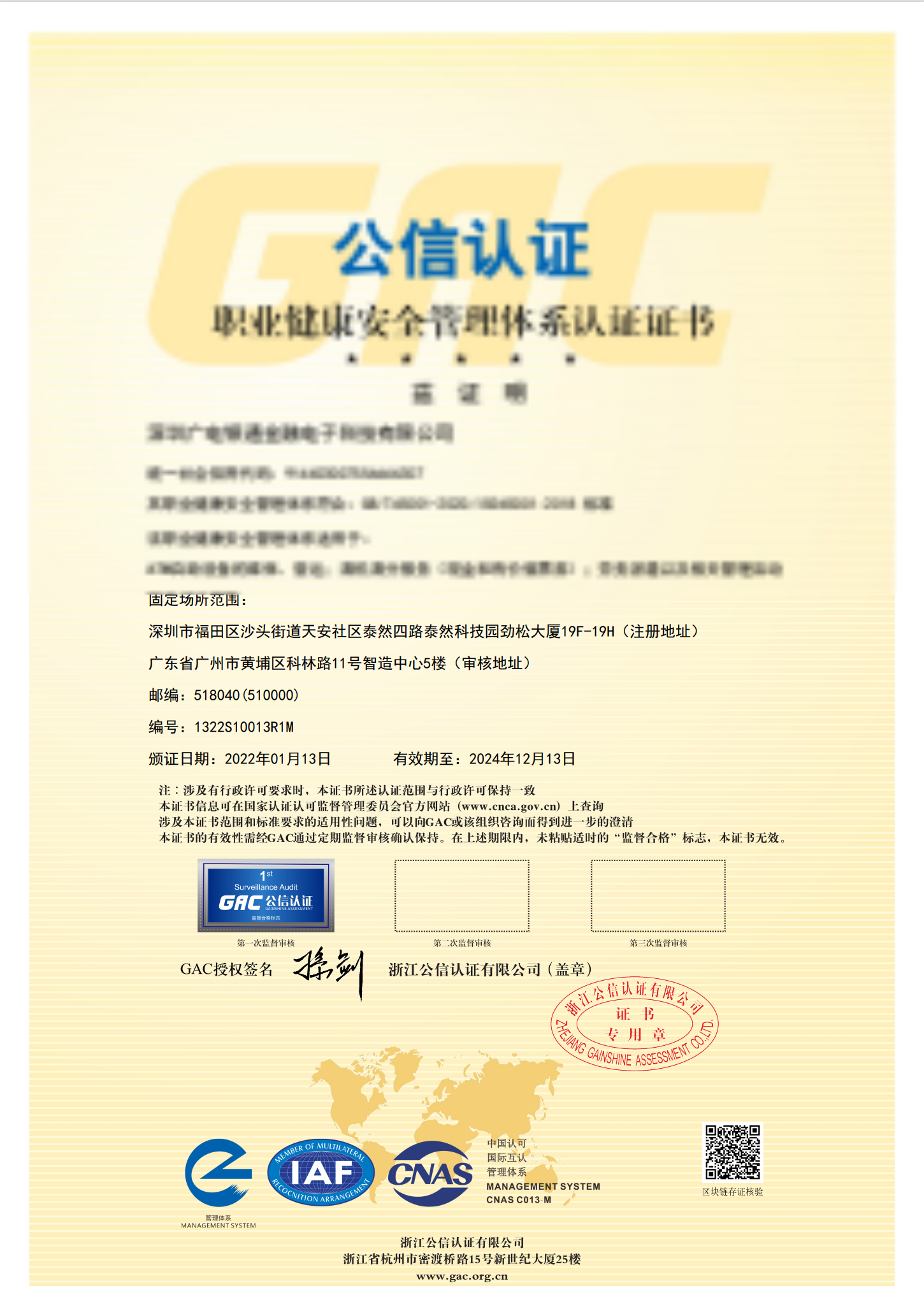深圳銀通職業(yè)健康安全管理體系認(rèn)證證書2023