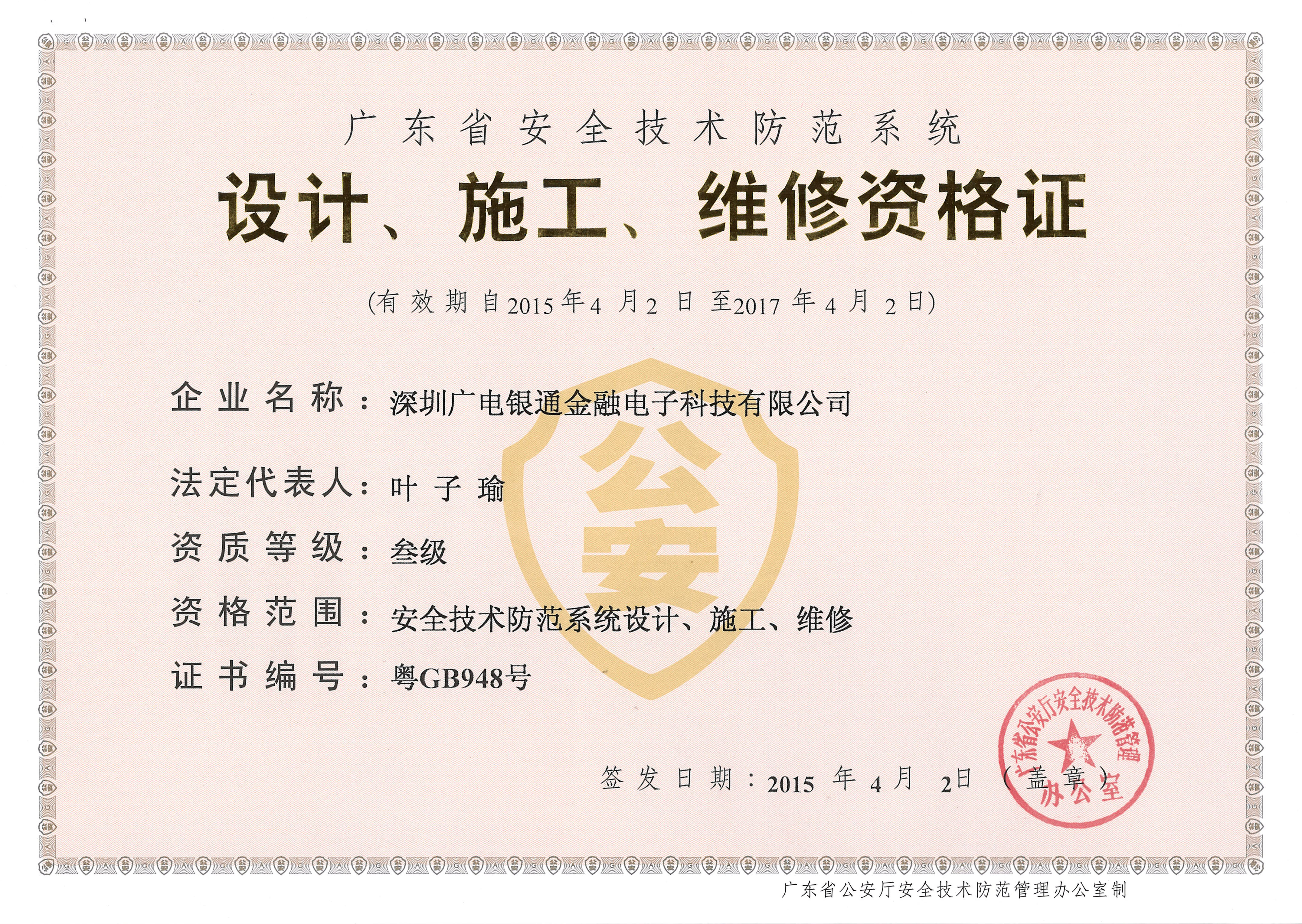廣東省安全技術(shù)防范系統(tǒng)設(shè)計(jì)、施工、維修資格證(四級(jí))