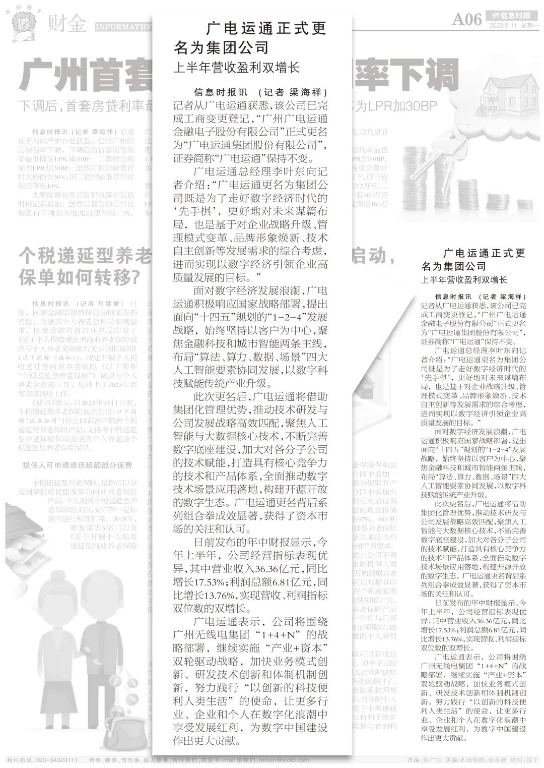 核心導(dǎo)讀 當(dāng)前,數(shù)字經(jīng)濟(jì)已經(jīng)成為驅(qū)動(dòng)全球發(fā)展的重要引擎。數(shù)字時(shí)代的生產(chǎn)方式、生活方式和社會(huì)治理方式正在發(fā)生翻天覆地的變化。黨中央高度重視數(shù)字經(jīng)濟(jì),把發(fā)展數(shù)字經(jīng)濟(jì)上升為國(guó)家戰(zhàn)略。在開啟全面建設(shè)社會(huì)主義現(xiàn)代化國(guó)家新征程中,抓住全面數(shù)字化轉(zhuǎn)型的契機(jī),不斷做強(qiáng)做優(yōu)做大我國(guó)數(shù)字經(jīng)濟(jì)是構(gòu)建現(xiàn)代化經(jīng)濟(jì)體系、推動(dòng)高質(zhì)量發(fā)展的必然要求。近日,廣電運(yùn)通正式更名為“廣電運(yùn)通集團(tuán)股份有限公司”,開啟數(shù)字經(jīng)濟(jì)時(shí)代新征程,獲得來自來自信息時(shí)報(bào)、上海證券報(bào)、全景網(wǎng)、新浪財(cái)經(jīng)頭條等綜合、門戶、金融、科技等各類媒體類型共計(jì)160余家媒體的報(bào)道。 8月17日,廣電運(yùn)通召開2023年第一次臨時(shí)股東大會(huì),表決通過了《關(guān)于變更公司名稱暨修訂<公司章程>的議案》。9月5日,公司完成工商變更登記,“廣州廣電運(yùn)通金融電子股份有限公司”正式更名為“廣電運(yùn)通集團(tuán)股份有限公司”,證券簡(jiǎn)稱“廣電運(yùn)通”保持不變。作為廣電運(yùn)通深化落實(shí)“1-2-4”戰(zhàn)略的重要舉措,此次更名向外界釋放了公司將通過構(gòu)建高效集團(tuán)化管理模式,持續(xù)深化“產(chǎn)業(yè)+資本”雙輪驅(qū)動(dòng)、搶抓數(shù)字經(jīng)濟(jì)“新賽道”、加快數(shù)字技術(shù)賦能實(shí)體經(jīng)濟(jì)的強(qiáng)烈信號(hào),標(biāo)志著廣電運(yùn)通以數(shù)字化轉(zhuǎn)型推進(jìn)企業(yè)高質(zhì)量發(fā)展進(jìn)入新階段。 廣電運(yùn)通科學(xué)城產(chǎn)業(yè)園 當(dāng)前,以數(shù)據(jù)為關(guān)鍵生產(chǎn)要素的數(shù)字經(jīng)濟(jì)已成為拉動(dòng)全球經(jīng)濟(jì)發(fā)展的新引擎。黨的十八大以來,黨中央高度重視發(fā)展數(shù)字經(jīng)濟(jì),將其上升為國(guó)家戰(zhàn)略,建設(shè)數(shù)字中國(guó)成為數(shù)字時(shí)代推進(jìn)中國(guó)式現(xiàn)代化的重要引擎。 此次更名凝聚了公司發(fā)展共識(shí),是廣電運(yùn)通不斷順應(yīng)國(guó)內(nèi)外環(huán)境局勢(shì),主動(dòng)適應(yīng)業(yè)務(wù)結(jié)構(gòu)升級(jí)和全球布局發(fā)展需求、推進(jìn)管理重心前移、完善全國(guó)一體化管控體系、提升集團(tuán)化管理水平邁出的新步伐,是對(duì)標(biāo)世界一流企業(yè)、推進(jìn)企業(yè)管理創(chuàng)新、加強(qiáng)集中實(shí)施產(chǎn)業(yè)布局的戰(zhàn)略舉措,為公司進(jìn)一步服務(wù)下屬組織、管控經(jīng)營(yíng)風(fēng)險(xiǎn)、提升經(jīng)濟(jì)效益提供了強(qiáng)有力支撐。 作為數(shù)字經(jīng)濟(jì)的核心驅(qū)動(dòng)力,數(shù)字技術(shù)是實(shí)現(xiàn)數(shù)據(jù)要素價(jià)值化的重要手段。多年來,廣電運(yùn)通堅(jiān)持自主科技創(chuàng)新驅(qū)動(dòng)戰(zhàn)略,圍繞“算法、算力、數(shù)據(jù)、場(chǎng)景”人工智能核心技術(shù)建立起“1個(gè)研究總院+6大專業(yè)研究分院”的研發(fā)架構(gòu),形成“總院基礎(chǔ)技術(shù)+分院應(yīng)用技術(shù)”的研發(fā)體系,不斷構(gòu)建完善數(shù)字技術(shù)核心競(jìng)爭(zhēng)力。2023年,廣電運(yùn)通重磅發(fā)布aiCore System V3.0,共涵蓋數(shù)據(jù)底座、AI底座的6大基礎(chǔ)技術(shù)產(chǎn)品和城市大腦、數(shù)字孿生、視頻云等3大創(chuàng)新應(yīng)用,能夠自動(dòng)化任務(wù)流程,快速構(gòu)建場(chǎng)景應(yīng)用,實(shí)現(xiàn)智能決策。同時(shí),依托aiCore System,結(jié)合多年行業(yè)知識(shí)積累,公司構(gòu)建了行業(yè)大模型——“望道”,打造AI+場(chǎng)景新范式,助推大模型行業(yè)落地的“最后一公里”。 aiCore System & 望道大模型 廣電運(yùn)通更名背后系列組合拳成效顯著,獲得了資本市場(chǎng)的關(guān)注和認(rèn)可。8月29日剛剛發(fā)布的年中財(cái)報(bào)數(shù)據(jù)顯示,2023年上半年公司經(jīng)營(yíng)指標(biāo)表現(xiàn)優(yōu)異,其中營(yíng)業(yè)收入36.36億元,同比增長(zhǎng)17.53%;利潤(rùn)總額6.81億元,同比增長(zhǎng)13.76%,實(shí)現(xiàn)營(yíng)收、利潤(rùn)經(jīng)濟(jì)指標(biāo)雙位數(shù)的雙增長(zhǎng)。