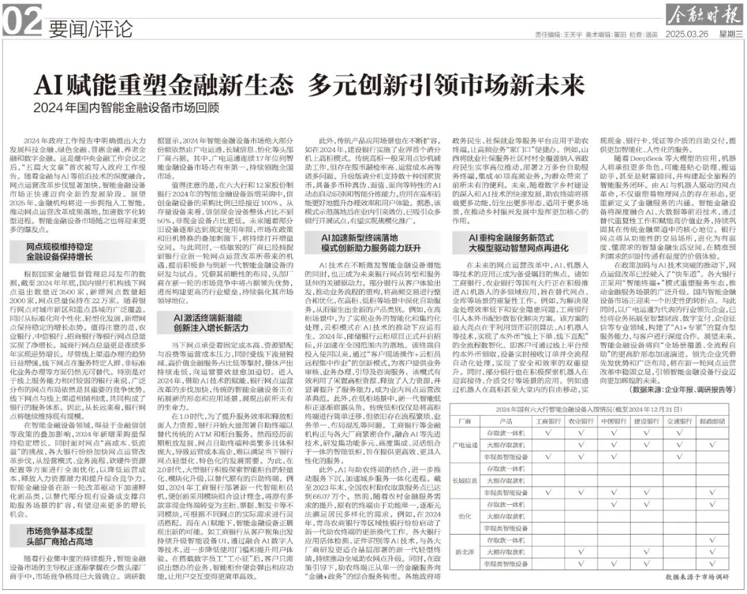 3月26日,國(guó)內(nèi)權(quán)威媒體《金融時(shí)報(bào)》發(fā)布《AI賦能重塑金融新生態(tài) 多元?jiǎng)?chuàng)新引領(lǐng)市場(chǎng)新未來(lái) 2024年國(guó)內(nèi)智能金融設(shè)備市場(chǎng)回顧》,對(duì)過去一年網(wǎng)點(diǎn)運(yùn)營(yíng)改革成果進(jìn)行了回顧,并展望了行業(yè)趨勢(shì)。報(bào)告數(shù)據(jù)顯示,廣電運(yùn)通連續(xù)17年位列網(wǎng)點(diǎn)智能金融設(shè)備市場(chǎng)占有率第一。以下為報(bào)告摘要: